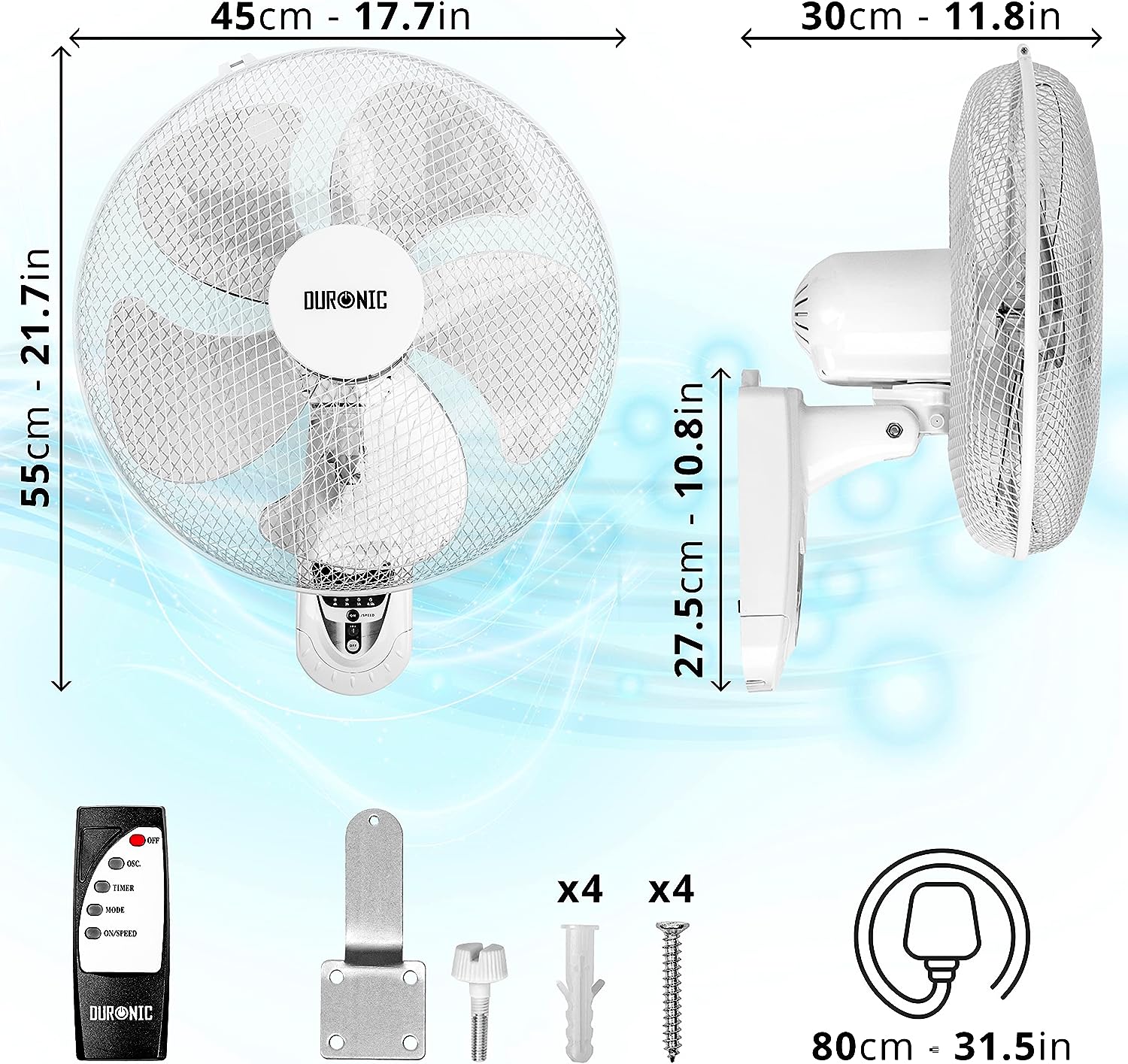 Duronic FN55 WE Wandventilator 60W | Durchmesser 40 cm | Ventilator mit Timer und Fernbedienung | 3 Geschwindigkeiten | Kompakter und leiser Raumventilator für die Wand | Oszillierender Wandlüfter